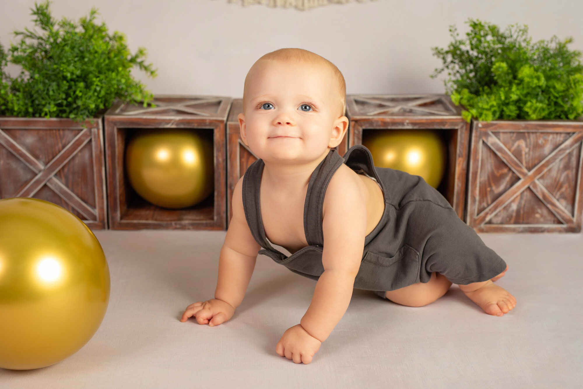 This little miss was full of smiles for her 1st birthday cake smash photo session! Her mama wanted neutrals with soft peachy pink and gold accents for her session. Through conversation during her pre session consultation, she told me about the gold candle holder lanterns that were part of her wedding décor. I knew they would fit the theme colours perfectly, so I asked her to bring them. All of the warm neutrals really allowed baby E to shine without to many distracting props. I loved her big smiles, and her perfect little red cheeks (she was definately getting some new teeth).