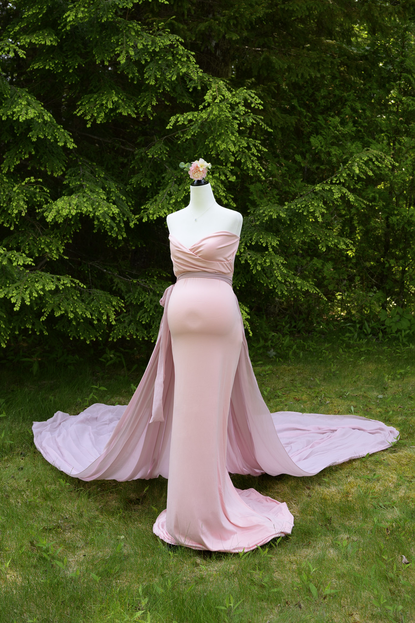 A romantic soft pink strapless gown that hugs your curves in all the right places. The form-fitting silhouette features a cross-front bodice for a flattering, feminine shape, while the stretchy fabric ensures comfort and ease of movement. Add a touch of drama with the removable flying dress train—perfect for capturing that magical, windswept moment or switching effortlessly between bold and classic looks.